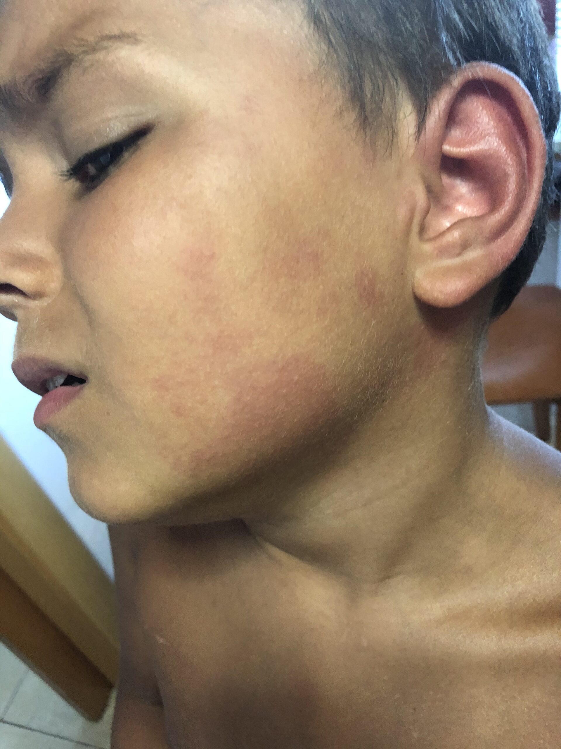 Here is a picture taken right after arriving to my place where i lived in Norway in 2019. I did not live in the house, i had an apartment one hour drive away from the house all of us lived in. Now i have just undressed my daughter to put her in the shower to make sure the reaction in her face was going away. This was not always only in the face. It happened regularly on the body as well. If you look closely you can see a red outburst at her chest. This red dot is something all my kids and myself are having when our body is under extreme reactions. I have no idea why it is coming, but the dot is in the middle of the chest at everyone. Our situation has lasted way to long, but as evidence will show everyone, i could do nothing with it.
