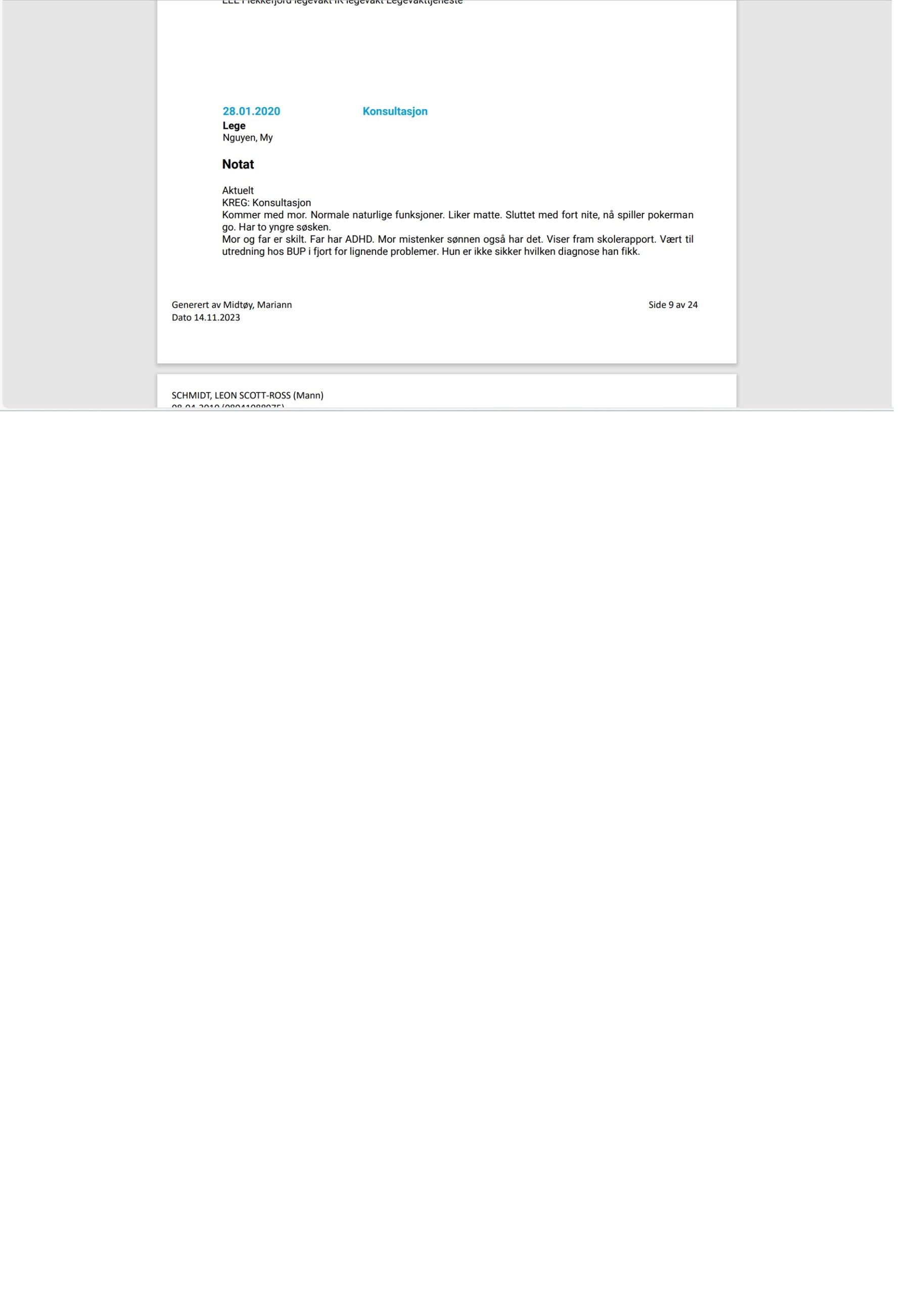 The ex has been very clear about her action when it comes to Leons ADHD. She have tried to hide it as much as she can, and says she never signed anything about ADHD or “never” said that Leon have “ADHD”. But now there is no escape anymore. 4 months before i got all my 3 kids she went to her own doctor to try and avoid the school system and make an diagnose on Leon without my signature. She knew i would not sign anything, and i did not know about this meeting she had with her doctor about my kid. That she manages to say that i have “ADHD” says it all when it comes to how desperate this woman is. I have no “ADHD”. Where does it say i have “ADHD”? So now i have “ADHD” and are “mentally ill” according to this woman.